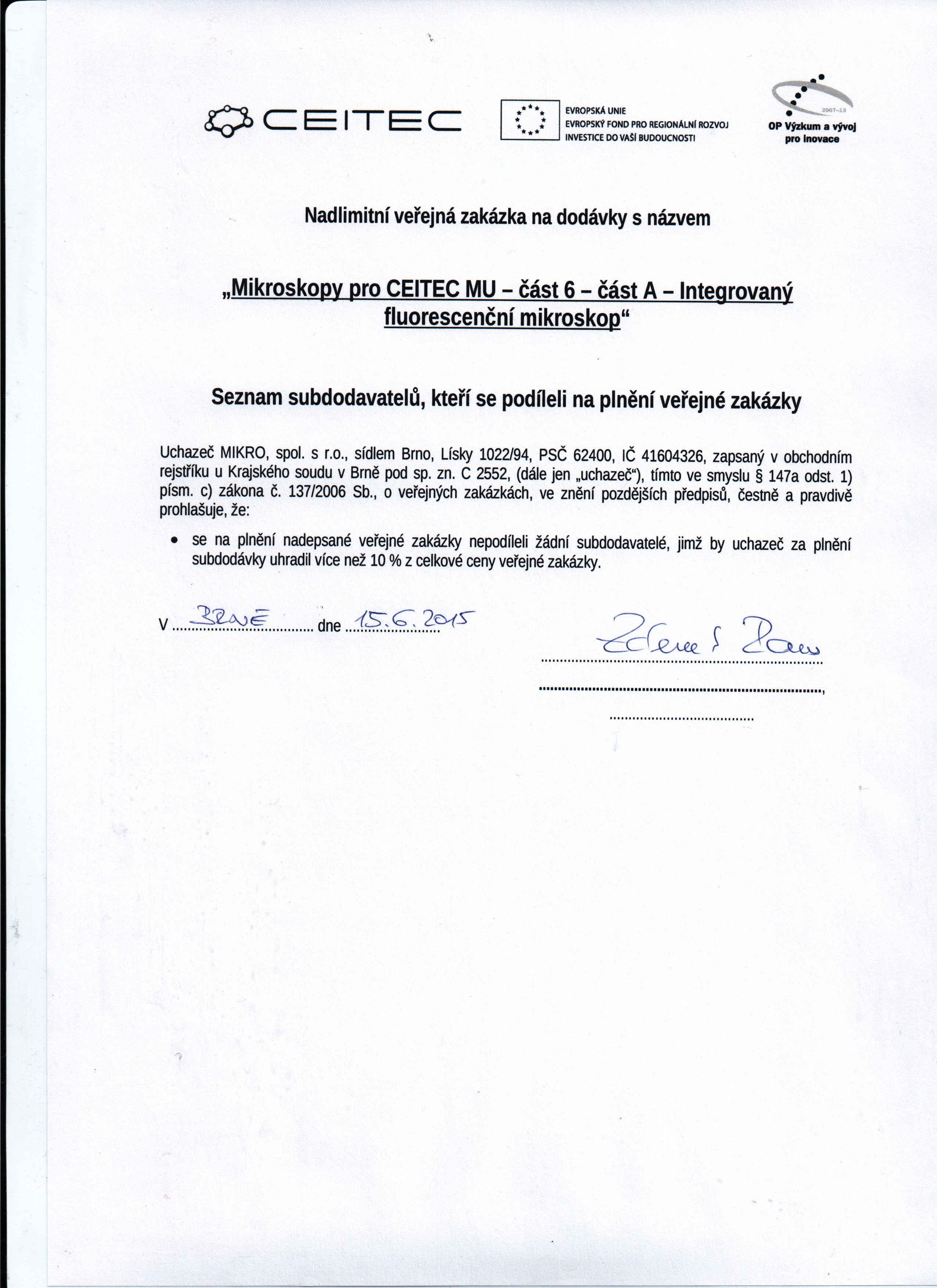Stručný popis předmětu: Předmětem veřejné zakázky je zejména dodání kompaktního integrovaného fluorescenčního mikroskopu pro zadavatele a splnění dalších s tím souvisejících závazků.